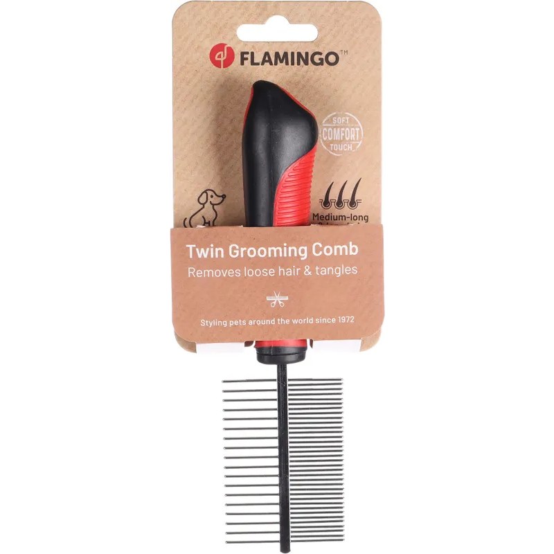 Peine fabricado en plástico y metal. Los diferentes dientes eliminan los pelos sueltos y recuperan el brillo del pelaje.