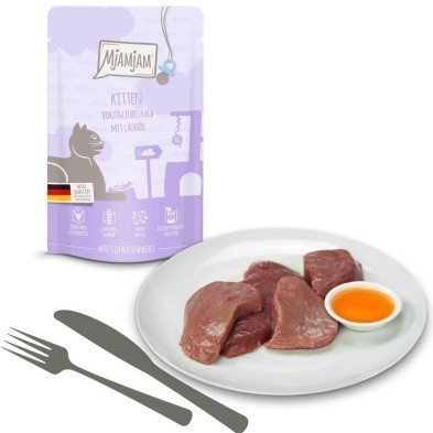 MjAMjAM Comida húmeda para gatitos Ternera y aceite de salmón. Este delicioso alimento proporciona a tu gatito todo lo que necesita. La tierna ternera, refinada con aceite de salmón de alta calidad, ofrece a tu gatito todas las vitaminas y nutrientes importantes para un crecimiento saludable y una experiencia única y exclusiva. ""Apropiado para la especie, cercano a la naturaleza y la presa"": esto significa para nosotros un contenido de carne muy alto. Se evitan por completo los cereales, el azúcar, los conservantes o aromatizantes, así como los aglutinantes sintéticos.