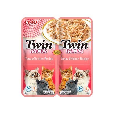 Los Churu Twin Packs ofrecen una deliciosa y saludable receta de atún y pollo en caldo de atún, hechos con ingredientes naturales y de alta calidad como pollo criado en granjas y atún salvaje capturado en su hábitat natural.
