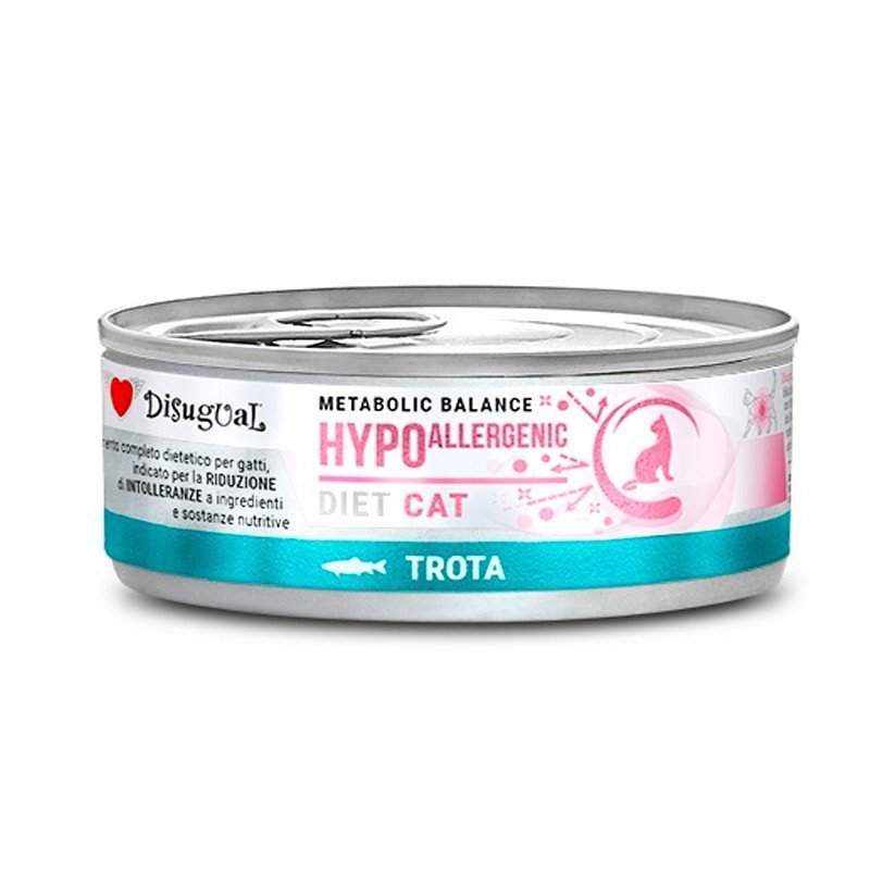 Disugual Hypoallergenic trucha es un alimento completo monoproteico, altamente palatable y diseñado para gatos con problemas de digestión, alergias e intolerancias alimentarias.