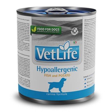 Farmina Vet Life Hypoallergenic Fish & Potato es un alimento húmedo dietético completo especialmente formulado para reducir las intolerancias alimentarias en perros.