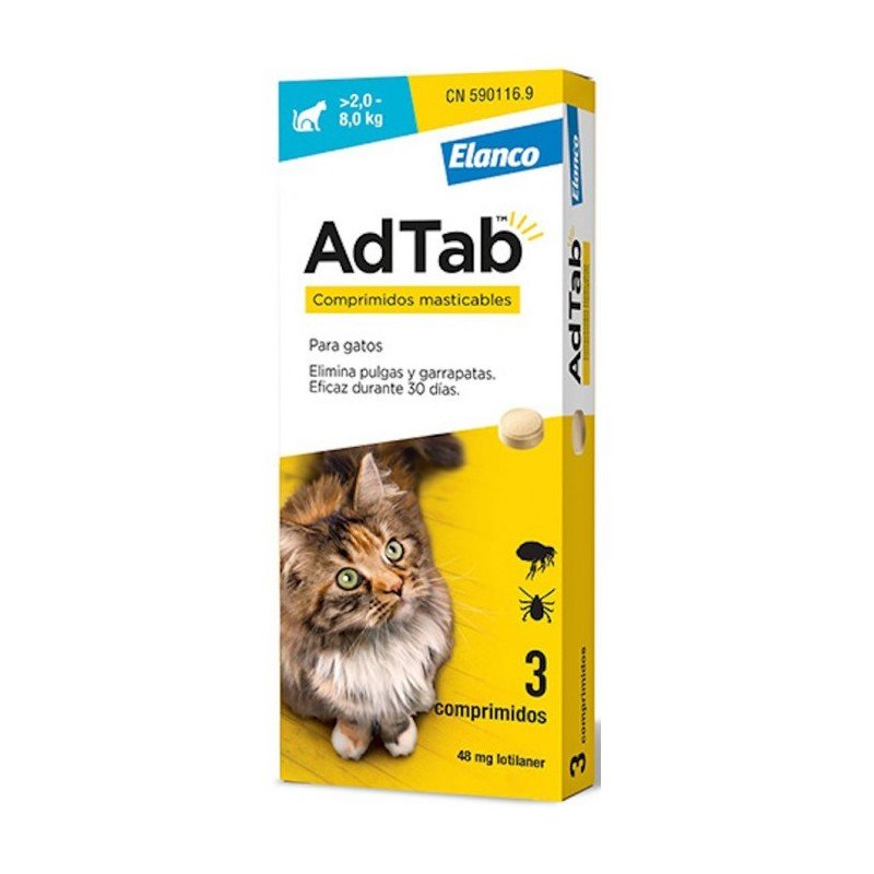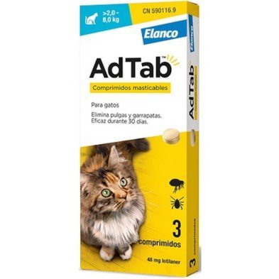 AdTab® es un antiparasitario oral para gatos que ofrece protección eficaz durante 30 días contra pulgas y garrapatas. Gracias a su principio activo, Lotilaner (48 mg), actúa de forma inmediata y persistente, eliminando los parásitos y ayudando a prevenir futuras infestaciones.