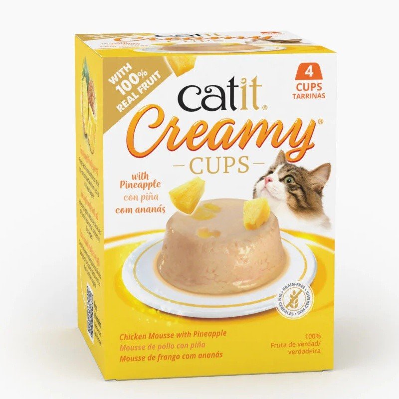 Delicioso, nutritivo y fácil de servir. Las Catit Creamy Cups de pollo y piña son el snack perfecto para consentir a tu gato con una experiencia única en sabor y textura. Esta mousse suave y cremosa, enriquecida con auténticos trozos de fruta, está elaborada con pollo criado sin jaulas, aportando proteínas de alta calidad en cada porción.