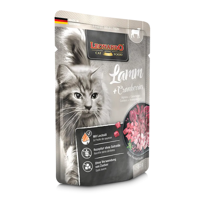 Nutrición avanzada con ingredientes funcionales. El sobre Leonardo Cordero y Arándanos combina cordero fácil de digerir con sabrosas aves de corral y arándanos rojos, un superalimento rico en antioxidantes naturales y vitaminas. Esta receta sin cereales ni azúcares añadidos es ideal para gatos con estómagos sensibles, y ayuda a mantener su vitalidad y bienestar.