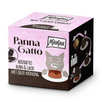MjAMjAM – Panna Gato Pollo & Salmón es un exquisito menú húmedo elaborado con ingredientes naturales y de alta calidad. Esta deliciosa combinación de pollo tierno, salmón jugoso y un topping afrutado convierte cada comida en una experiencia culinaria única para tu gato.