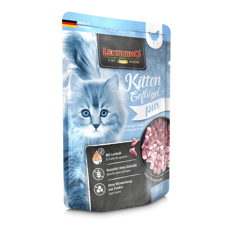 El Leonardo Kitten Puro en Ave es un alimento húmedo de alta calidad, elaborado en Alemania, especialmente diseñado para cubrir las necesidades nutricionales de los gatitos durante sus primeros meses de vida. Su receta está formulada con carne de ave baja en grasa y vísceras ricas en nutrientes, lo que aporta proteínas altamente digestibles y energía adaptada al crecimiento.