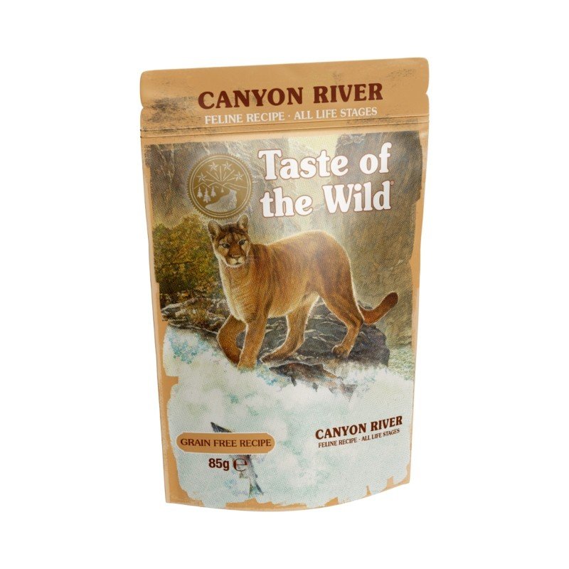 Taste of the Wild Canyon River es un alimento húmedo completo para gatos de todas las edades, elaborado con tiernos trozos en salsa que aportan una textura jugosa y altamente palatable. Su receta está inspirada en la alimentación natural del felino y combina proteínas animales de alta calidad con una digestibilidad excelente.